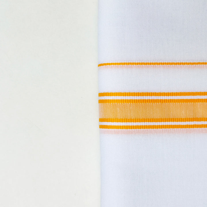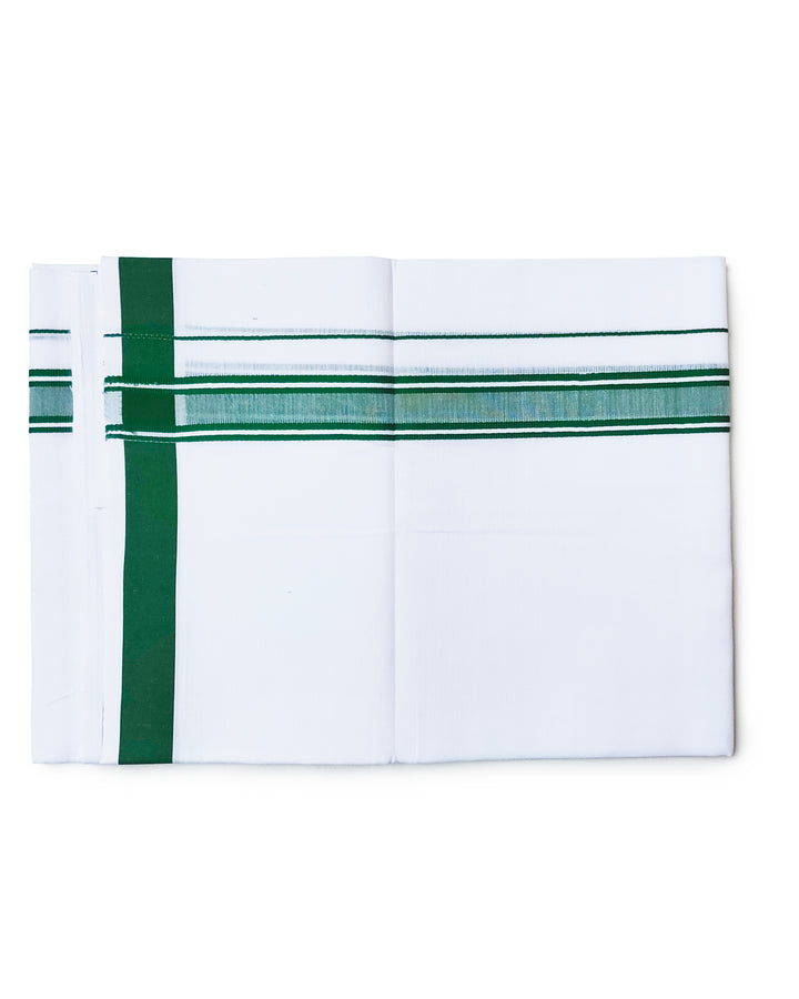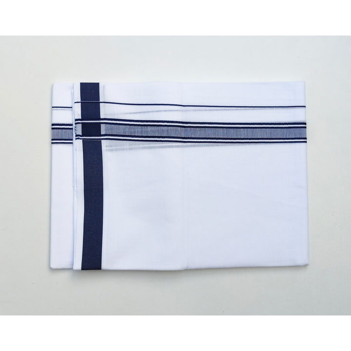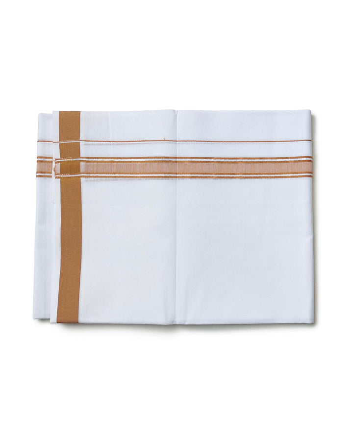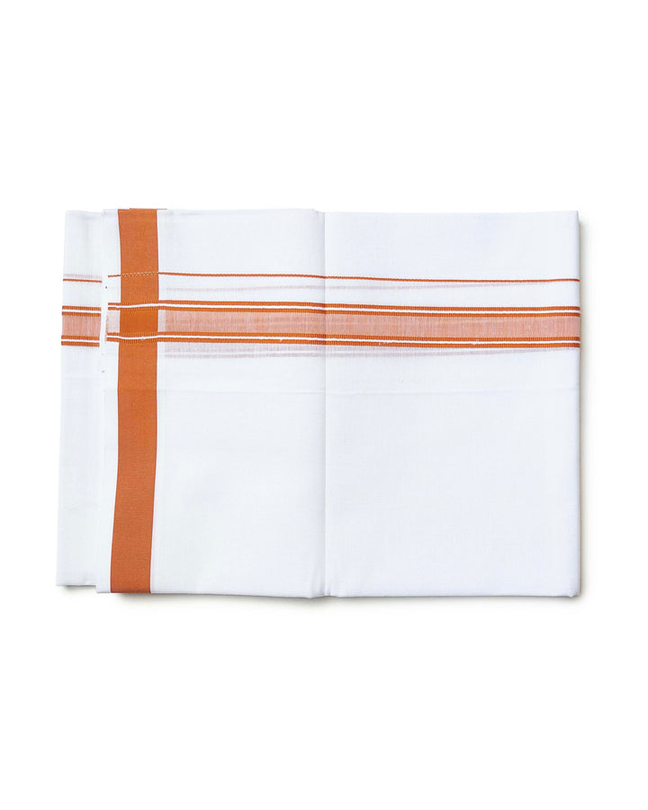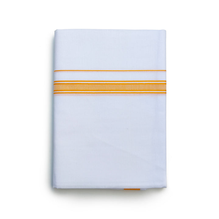 Pure cotton White dhoti with 1" VK Fancy border. Traditional wear for regular use an also for weddings and festivals. The fine quality of Cotton Yarns used makes the wearer feel More comfortable. Shop a traditional Dhoti online at Kalachar Online.